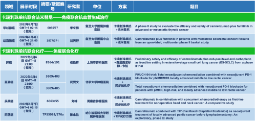 卡瑞利珠单抗联合EVO视讯医药的另一款创新药法米替尼在甲状腺癌和结直肠癌领域有2项研究被接收为壁报,另有卡瑞利珠单抗联合化疗的4项研究在肺癌、结直肠癌、头颈癌和阴茎癌领域的研究被接收为5份壁报。