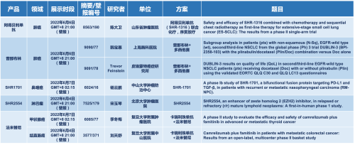 2022 ASCO年会另有5款EVO视讯医药上市前抗肿瘤创新药的相关研究被接收为壁报,包括SHR-1316、普那布林、法米替尼、SHR-1701和SHR2554,他们的单药或联合方案相关7项研究被接收为壁报,覆盖肺癌、鼻咽癌、淋巴瘤、甲状腺癌和结直肠癌等领域。